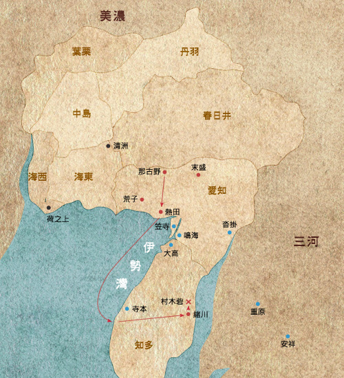 1月22日意外地大風。船長、水手都説不能出海,信長堅持:「以前,源義經和梶原景時曾在渡辺、福島爭論是否逆風而行,當年的大風大概和今天差不多吧。總之今天一定要出海。快去準備船隻!」船隻航行1小時約8公里靠岸。當天軍隊在野外紮營,信長則去找水野下野守(水野信元※)詢問當地情況,其後在緒川留宿。