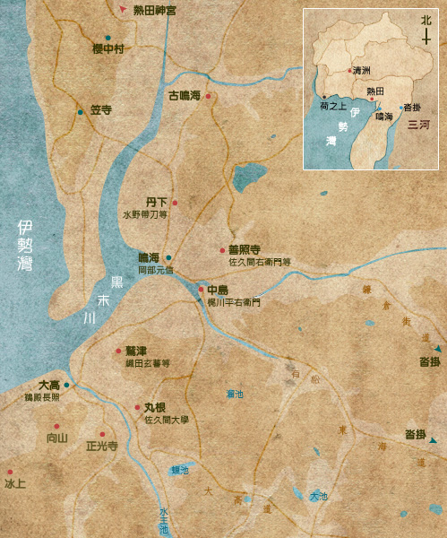 ③鳴海以南有一條叫中島的小村,在此建立城寨,梶川平右衛門(梶川高秀)駐守。