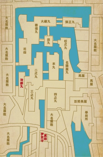 但究竟這兩位好友住得有多近呢?現階段能夠確定的只有伏見城的治部少丸的位置。而伏見城城下町古地圖亦有標示治部少丸的右下方有真田伊豆守的屋邸。在網上搜尋有關伏見城武家屋邸時,找到京都市埋藏文化財研究所的一份資料(伏見城跡発掘調査現地説明会資料)顯示三成另一上屋敷(指最接近城中心的屋邸)在京都橘中學校・高等學校南邊,而真田伊豆守的屋邸位置不變。如果推斷是正確的話,兩人屋邸的確是非常接近。